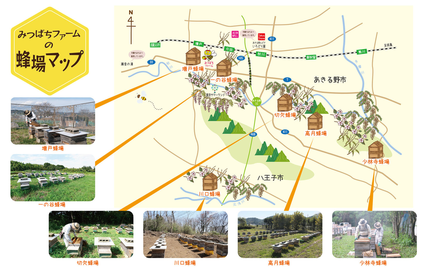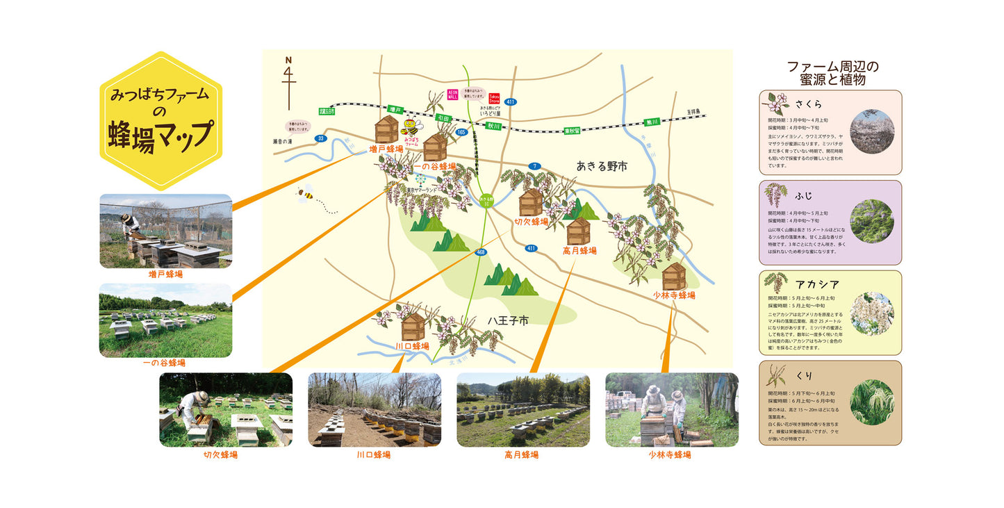 主な蜜源は秋川(あきがわ)沿い多摩川(たまがわ)沿いの里山丘陵地にあります。2つの川の合流地点もポイントです。あきる野市と八王子市にまたがっています。(厳密には昭島も)アカシア、山桜、山藤、山栗、ケンポナシ、エゴなどが花を咲かせてくれるおかげで安定した運営ができています。え、何か問題でもあるのかな?と思うところですが大きな課題が所狭しとあるのです。