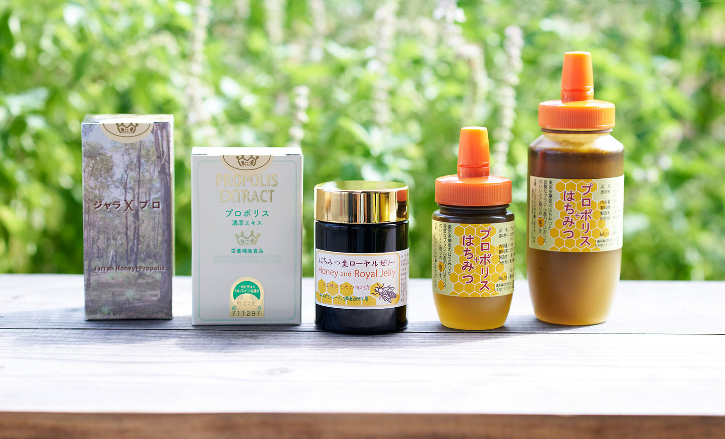 ブラジル産の質の高いプロポリスの原塊から抽出する「プロポリス濃厚エキス」や台湾産のローヤルゼリーと多摩のはちみつで作る「はちみつ生ローヤルゼリー」、オーストラリア産のジャラハニーとプロポリスで作る「ジャラX プロ」など、独自の手法で製品化しています。